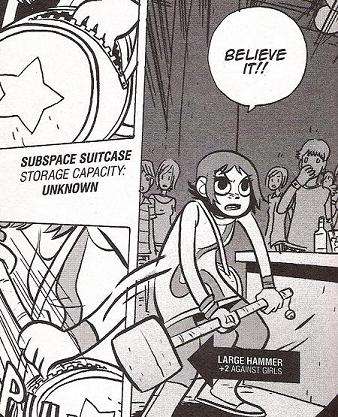 - Scott Pilgrim books, Ramona whips a huge hammer out of a relatively tiny purse. She explains this by saying it's a trans-dimensional purse.
