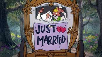 See also True Love's Kiss, Died Happily Ever After, Babies Ever After, Dance Party Ending, The Good Guys Always Win. Contrast Downer Ending and Bittersweet Ending, the cruellest examples of which make us think they're going to be a case of this trope before yanking the rug out from under the audience. Compare Maybe Ever After, which leaves open the possibiity of a happily ever after ending, but doesn't make it a certain conclusion, and Earn Your Happy Ending, in which the characters only live Happily Ever After if they're prepared to put some effort into it. In more modern works, even a straight Happily Ever After can have the rug pulled out from under it in the sequel, in which we catch up with Prince Charming and his princess and find that they're getting on each other's nerves and have to fall in love all over again.