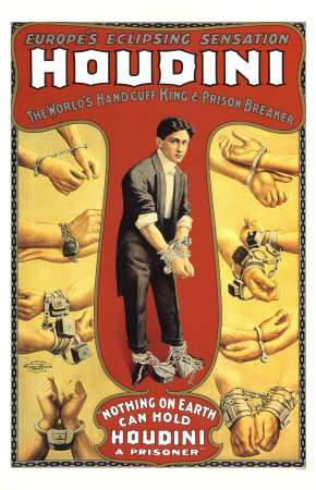 - Escape Artist: While certainly not the first, Houdini is the Trope Codifier and Ur Example; his name is synonymous with "escape artist", even nearly a century after his death. He was so good that police departments and major metropolitan newspapers would issue challenges to him.