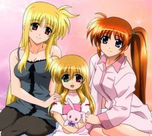 - Magical Girl Lyrical Nanoha has Vivio with Nanoha and Fate (pictured above). Vivio calling them both "Mama" for the first time was accompanied by the sound of the Nanoha/Fate shippers going Squee. The Has Two Mommies trope is later Lampshaded by a minor character.