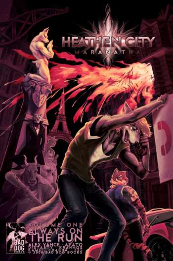 Heathen City is a 2008 furry homoerotic noir thriller series of graphic novels by by Alex Vance. (Not that Vance, mind you) It originally started between 2004 and 2006 as an unfinished novel called Maranatha which takes place years before Heathen City itself.