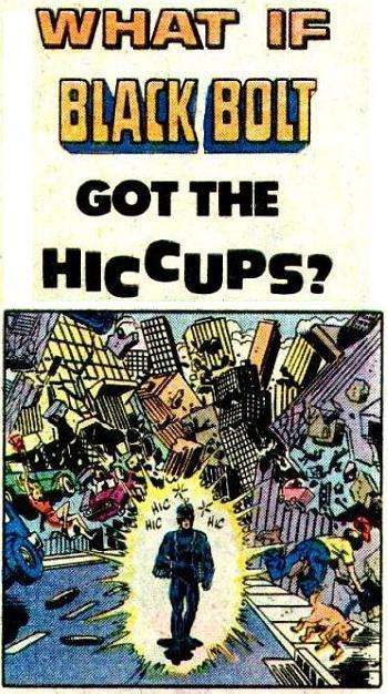 - Marvel Universe has this trope spoofed in issue 34 of their "What If" series, with Black Bolt. Yeah. Black Bolt with hiccups.