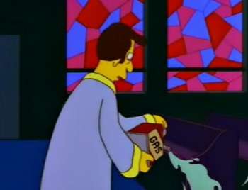 - Reverend Lovejoy from The Simpsons. Though he is the local reverend, he seems to be faking his religious beliefs. When the Movementarians gain popular momentum, Lovejoy is so quick to give up on trying to promote Christianity that when Marge shows up at his church, he is soaking it in gasoline. He also seems not to be that good at preaching moral decency to his own family, if his gossipy wife and manipulative daughter are anything to go by. (When the latter reminds him of past misdeeds of her own, he just plugs his ears and pretends not to hear anything.)