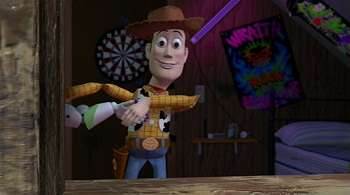 - Toy Story: Buzz Lightyear, who originally believed he was the real Buzz, has gone temporarily insane after having his worldview shattered when he found out he was just a toy. His (toy) arm gets broken off in attempt to fly; later, he throws the dismembered arm at Woody in anger. Woody has to convince the other toys that Buzz is okay. He hold's Buzz's arm out from behind a wall, as if Buzz was actually standing just behind the wall, and proceeds to (badly) mimic Buzz's voice while waving the arm around.