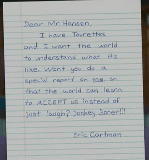 - South Park had an entire episode dedicated to Cartman pretending he had Tourette Syndrome so he could swear to his heart's content without getting into trouble. However, it also subverted the practice; the characters who actually had Tourette Syndrome were portrayed more realistically. Only two of six people were cursing, and unlike Cartman, it was usually the same word. The episode also had Cartman get a condition similar to Tourette's Syndrome; because he kept saying everything he thought, he subsequently developed a Truth Tic, and lost his ability to filter what he said, and at the end had to see a therapist because he couldn't stop shouting embarrassing secrets about himself.