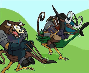 - Rift: A male bahmi (the towering stouts of the Defiant faction) on a vaiyuu (somewhere between a gazelle and an Oviraptor). Hard to decide to whether to laugh or worry that the mount is about to collapse.