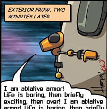 - Kevyn from Schlock Mercenary has lately taken to reprogramming rogue Burnabots and strapping them to the ship's hull as extra armor.