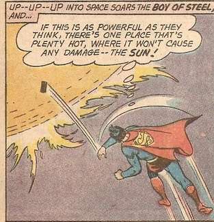 - In a variant in one episode, Superman's skin is contaminated with a mass of microscopic radioactive particles that forces him to be in radiation proof containment on Earth. Here, the solution is to fly towards the sun, not to enter it, but just to enter its gravitational field to allow it to pull all the particles at once.