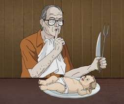 - Suehiro Maruo's manga A Defenseless City is set in WWII Tokyo. A midget befriends a destitute mother and her son (the father has gone to war), and hires her to work in his stall that sells roast chicken splits. One day the boy disappears, and the mother, after a long fruitless day of search, is consoled by the midget, who offers her a dish of "chicken" splits. She eats, not realizing that she is partaking the flesh of her son.
