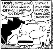 - Mr. Square Has a prime example, wherein Mr. Square says, verbatim "I know that you know that I know what you know about knowing that I know, but you don't know that my knowledge of you knowing is not secret, I WANT you to know that I know so you don't know what I don't....you know?" in this comic