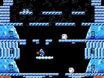 - Jump Physics: Besides the above Hitbox Dissonance, the Ice Climber can't control their direction of jumping so well once they're in the air. It's tricky, but you can also harm Nitpickers this way by having their mallets hit them as they jump.