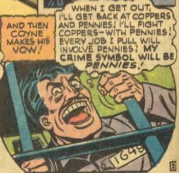 - Joe Coyne (pictured above) was a failure as a criminal. Not only was he regularly caught by the police ("coppers"), his crimes only netted him pennies. Thus, to get back at "coppers and pennies," he launched a career as the Penny Plunderer. A career that Batman ended on his very first outing, but Joe's theme outlived him; he (not, as is often assumed, Two-Face) provided the giant penny that became a fixture of the Batcave.