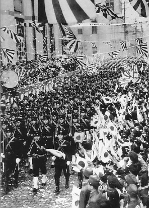 It is during the Meiji era that Japan established itself as an international power and a colonial Empire. The newly industrialized and modernized Japanese forces allowed the Japanese Empire to field forces almost as good as if not quite on-par with those of China and Russia during the course of the First Sino-Japanese war and the Korean annexation. It was, however, Japan's centralized command system and the abilities of her commanders that saw her come out on top in both engagements. Though outnumbered, their forces were generally (far) better coordinated and more mobile - there are parallels to be drawn with the Franco-Prussian war in this regard.