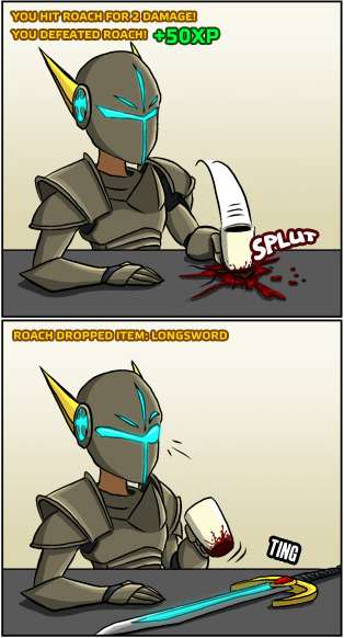 - Averted with Kingdom of Loathing, where monsters drop very... unusual items that make perfect sense for them to have. Of course, this is the game that decided to justify most monsters dropping money by using meat as the Global Currency.