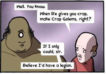- One Knights of the Dinner Table strip had the players complaining about to the GM (Jonnny Kizinski) about the villain being able to assemble a golem out of components he found in a broom closet.
