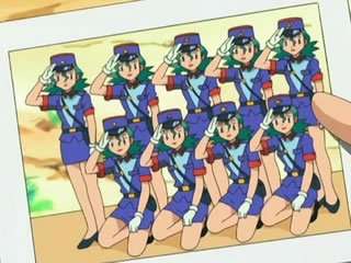 Brock: Jenny from Viridian City wears her skirt shorter than the other Jennys. The Celadon City Jenny uses styling gel in her luxurious hair! Saffron City Jenny wears exotic Vileplume No. 5 Perfume. Then there's the vivacious Vermillion City Jenny... [Misty carts him off the screen before he can continue] |