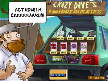 - Played totally straight in Plants vs. Zombies, where the shop you buy seeds and the like from is run by Crazy Dave, and called Crazy Dave's Twiddydinkies. Dave himself is a blabbering lunatic who wears a pot as a hat and frequently yells "Buy now! I'M CRAAAAAAZY!!!" at the player whilst frothing at the mouth and shaking. Quite bizarre, but a nice calm experience compared to the rest of the game...