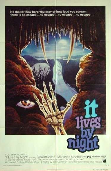 It Lives by Night, also known as The Bat People, is a horror film from 1974 that's best known for its appearance on Mystery Science Theater 3000. It's the story of a researcher who suffers a case of The Stupids and wanders off trail in a cave. Of course, he gets bitten by a bat, and from then on periodically turns into a sort of half-bat-half-human monster.