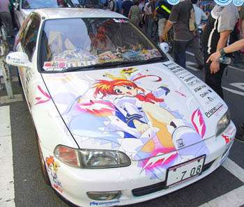The term itasha refers to any car which has been modified with vinyls, stickers, or other decorations relating to anime or games. It's a pun on the homonym itasha (confused yet?), which is a short form for "Italian car" (i.e. Lamborghini, etc.). The "itasha" we're concerned with here replaces the abbreviation "ita" (Italian) with the kanji for "pain", referring to the painful embarassment which the owner is expected to undergo when explaining to his (it's almost always "his") family and friends exactly what the hell he was thinking.