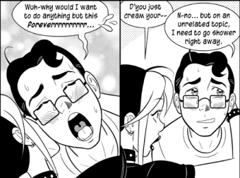 In anime, a similar situation usually causes an explosive Nosebleed. Compare to Raging Stiffie. Contrast with The Loins Sleep Tonight. The end result of a Nocturnal Emission. A man ejaculating too quickly while making love is Speed Sex. Often combined with The Grunting Orgasm.