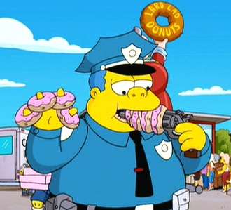 - In The Simpsons Movie, Chief Wiggum can't carry enough donuts, so he stacks them on the barrel of his gun, and then eats them straight off it. The gun goes off while he's between bites, blowing a hole through his hat. He says "Whoa, that was a close one!" and continues eating. Another episode, showing film of him when he was younger at a firing range, has him looking down the barrel after his gun stops and getting yelled at by his instructor ("What did I say about pointsy-twardsies?"). He then gives the instructor a back massage with the gun and it goes off and shoots the cameraman. He's later shown to have gotten the position of Chief by giving the Mayor a back massage with his gun. Another episode showed Wiggum cleaning his ears with the barrel of his gun, and yet another showed him firing at his TV after forgetting where he left the remote. It was in his gun holster.
