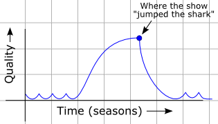 This expression originates from the episode of Happy Days in which Fonzie, dressed in his trademark leather jacket, literally jumps over a shark on water-skis during an episode shot on location.