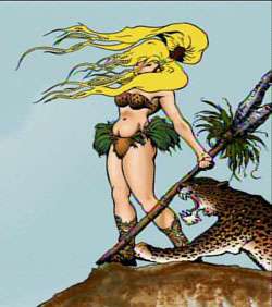 The Distaff Counterpart of Tarzan of the Apes, this is a young woman of European extraction who has been raised in a jungle environment, usually by animals. Despite her upbringing, though, she has managed to grasp the basic rudiments of English, tools and fashion—she is frequently seen wearing fetching leather or fur bikinis and wielding a spear. She is far more likely to have Rapunzel Hair than Wild Hair, and her legs and armpits will be inexplicably hairless.