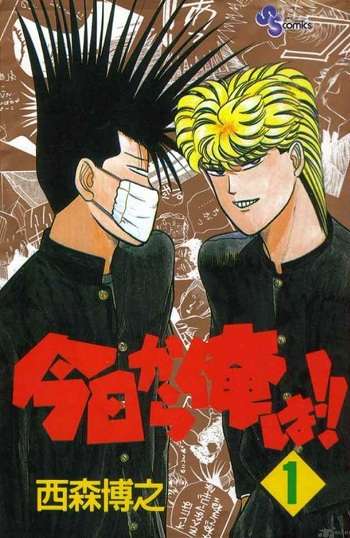 Kyou Kara Ore Wa!! was a Shonen gag manga that ran from 1988 to 1997. It revolves around two high school boys who decide to become delinquents after transferring to a new school. They meet for the first time on the day before school starts at a salon, where they decide to begin their image change with a new hairstyle, and so begins their journey to become the biggest delinquents Japan has ever seen!