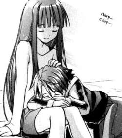 - In Mahou Sensei Negima, Negi does this a lot, falling asleep on his students' laps on numerous occasions. The romantic overtones are usually subverted. Such as when he falls asleep on Konoka's lap (pictured above), leading the cheerleaders (and Ayaka, who promptly freaks out) to believe that they're secretly dating, when in fact he's just exhausted. Naturally, Ayaka is overjoyed when Negi conks out on her lap later on, again due to fatigue.