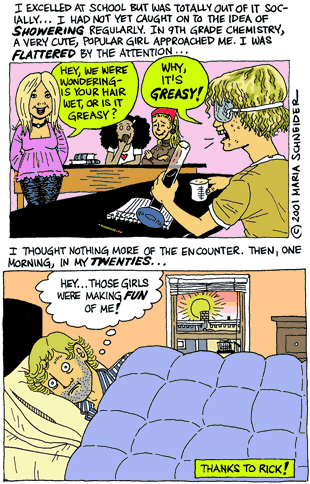 - Matt Groening's Life in Hell has a very cute one. Milhouse Mouse is telling all his friends (including Bongo the Rabbit) a dirty joke about a lady who owned a little dog named "Freeshow." The punchline is that one day the lady was in the bathtub and realized that Freeshow had gotten out, so she jumped out of the tub and ran out the front door, tearing down the neighborhood street completely naked while screaming: "Freeshow! Freeshow!" All the kids laugh except for Bongo, whose face remains expressionless. Then he goes home, does his homework, eats dinner, etc.....before finally climbing into bed for the night, and then he gets the joke and starts laughing.