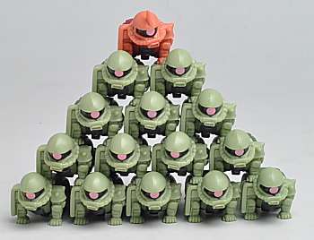 - Chromatic superiority is invoked - sort of - in one SD Gundam skit. The Gundams convince a bunch of Zakus to get drunk on sake so they'll turn red and go faster. Ends up being a subversion, as the drunken Zakus can barely move in a straight line, let alone at speed.