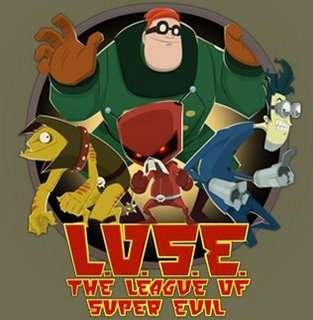 The League of Super Evil (acronym L.O.S.E.) is a cartoon series that aired on YTV between 2009 and 2012 about a Quirky Miniboss Squad made up of Ineffectual Sympathetic Villains. The team is led by the Pointy-Haired Boss Voltar, a Card-Carrying Villain and all-around Large Ham. He constantly attempts to be evil, but is largely incompetent of anything more serious than Poke the Poodle. Forming Voltar's posse of mooks is the Mad Scientist Butt Monkey Doktor Frogg and the Dumb Muscle Red Menace. Their Team Pet Doomageddon is a pandimensional hell doomhound and Extreme Omnivore.