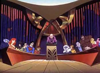 - Justice League featured this thrice: the two versions of the Injustice Gang in the episodes "Fury" and "Injustice For All", and the Secret Society in the episode "Secret Society" (naturally, after the above comic). The sequel series, Justice League Unlimited, made another such group, albeit much larger and better organized, the focus of its third-season arc; this group was unnamed, but was variously called the Legion of Doom and the Secret Society by fans. (Lex does refer to it as a "society" at one point.) The entire third season was basically a homage to the aforementioned Superfriends, complete with Darkseid showing up as the True Final Boss to replace them.