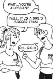 The Lesbian Jock, as her name would suggest, loves sports and also loves the ladies. Usually, this trope either takes the form of lesbian characters playing sports, or other people assuming (correctly or incorrectly) that a female character is a lesbian because she enjoys sports. There seems to be a sliding scale of which sports are acceptable for girls without questioning their femininity and which are not. Performance-based sports like gymnastics, figure skating, diving, and cheerleading are all "okay"; most competitive sports like softball, volleyball, track, soccer, tennis, and basketball are 50/50; but "masculine" sports like wrestling, American Football, rugby and, strangely enough, golf are almost a sure bet. One common subtrope is the Butch Lesbian P.E. teacher.