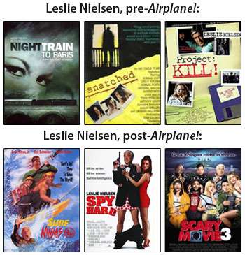 - As noted in the description, the Trope Namer is, of course, the late, great Leslie Nielsen of Airplane! and Police Squad! fame. Prior to Airplane!, Nielsen had a long dramatic career that spanned television and film. He often played military commanders and police detectives, with the occasional medieval king or Roman senator thrown in for good measure. Offers of leading roles had pretty much petered out by the 1980s. And then came his appearance in Airplane!. The ironic thing is that, in Airplane!, he's perfectly deadpan and not personally all that funny at all when compared to the other performances. The same goes for The Naked Gun movies. His ability to act completely serious about ridiculous things was his major strength as a comedic actor.