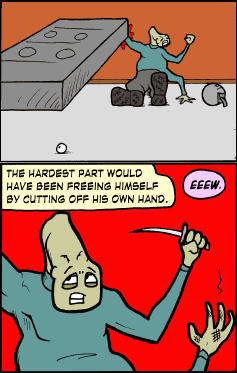 - Truth in Television: Aron Ralston, number six on the Cracked article "7 People Who Cheated Death (Then Kicked It In The Balls)". While mountain climbing, one of his arms got trapped under a fallen boulder... so he cut it off. With a penknife. A dull penknife. It was sharp when he started out, but he first tried to use it as a lever to get the rock off, dulling the blade. He had to snap the bone completely in two before he could start cutting.