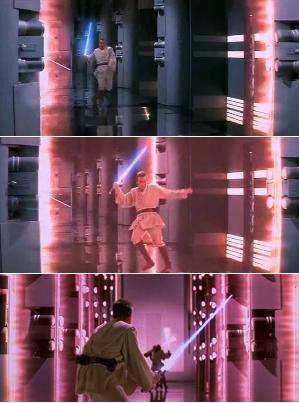 - In the final fight of Star Wars: Episode I, Obi-Wan is cut off from the fight between Qui-Gon and Darth Maul by some ominously glowing force-fields, and as such, can't help.