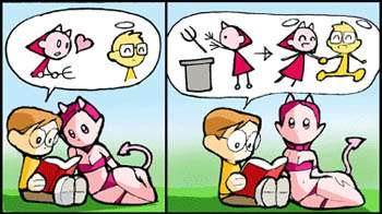 Despite all these obvious reasons to avoid any and all romantic entanglements, Love is very nearly as (or more!) addictive than The Dark Side. These two forces interact very curiously, Love can just as easily lead a Knight in Shining Armor into the Dark Side, as it can drag the most committed, bloodthirsty, puppy-kicking villain kicking and screaming into being redeemed. Whether they're a Fallen Hero who starts Dating Catwoman, a Career Killer who fell In Love with the Mark, or the Necessarily Evil who gains a Morality Pet that gives him something to live for, love tends to corrode evil like lemon on popcorn (and it tastes so good!) even if it frightens at first. By and large, Love tends to subvert rather than aid evil, Unholy Matrimony not withstanding. If it isn't Heroic Resolve it's Heroic Willpower, making even the most soul corrupting evil as weak as a Sickeningly Sweet kitten.