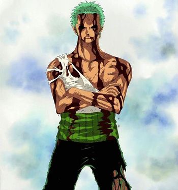 - Let's not forget Zoro. He's taken a giant sword-slash to the chest, tried to cut off his own feet to escape some chains, and, during Thriller Bark, shows his badassery by taking all of Luffy's pain in attack form- with the bloody result shown in the page picture (not shown is the blood covered ground spread out several feet around him). Although all he needs to do to recover is put on a few bandages and take a nap. This is averted after the aforementioned incident with Luffy's pain as Zoro still suffered from those injuries for several battles following it.