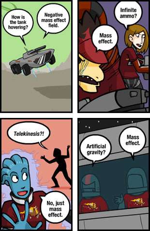 - Mass Effect uses this as its Character Title Drop, despite being one of the hardest Space Operas to date. How does Casual Faster-Than-Light Travel work? Mass Effect Fields, generated by Element Zero. How do the Flying Cars fly? Mass Effect Fields, generated by Element Zero. How do Biotics move things with their minds? Mass Effect Fields, generated by Element Zero. How do the guns have Bottomless Magazines? Mass Effect Fields, generated by Element Zero. How do the Reapers build a space station in the galactic core?