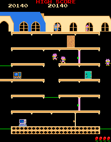 The player controls Mappy, the "Micro Police" officer, a police-mouse whose job is to collect valuables from a cat's house (one has to surmise that he is retrieving stolen goods). In hot pursuit of our hero is a gang of five pink cats called Meowky (Mewkies in the Japanese version) or "Naughty Folks" and a large red fat cat called Goro ("Nyamco" in the Japanese version) or "Boss the Big Bit".