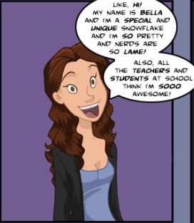 Mary Sue Classic is perfect. Everything she does is perfect and everybody knows this. She may or may not acknowledge this (after all, you can't be too humble), but deep down in her (perfect) mind, she's the most aware of everybody. The heroes can't seem to find any topic of conversation but how wonderful (and perfect) she is and the villains can't help but have a grudging respect and secret lust for her. In a high school setting, she's that one girl that every guy wants to date. This is pure Wish Fulfillment, as no real high school has such a girl, even if some are more popular than others. In real life, exclusive popularity and desirability is prevented by the fact that teenage boys are horny. She can't help but cause men to fight over her (perfect) presence. However, with a (perfect) word, she can convince anybody that she's too (perfectly) good for them and make them fall in place. She might come across as prudish at first as she resists the charms of the hero (or, perhaps, the Ensemble Darkhorse), but she'll succumb in the end. Once they're together, everybody else who was competing for her (perfect) charms will accept it because they want her to be happy. They won't even be jealous. Instead they can express their smittenness through Courtly Love and swearing that they're dying to do her (perfect) bidding.