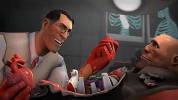 - The Team Fortress 2 video Meet the Medic. Roughly half the video involves the RED Medic performing surgery on the Heavy, in a procedure involving a device (which, as it turns out, enables the Übercharge in-game) getting shoved onto Heavy's still-beating heart, said heart exploding and being replaced with a "Mega Baboon" heart, and Medic pushing the organ into the Heavy's chest cavity so hard he breaks off a rib. All while the Heavy is awake, mind you.