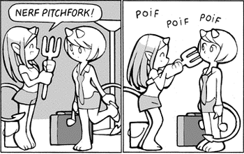 - During the "That Which Redeems" story arc from Sluggy Freelance, the Dimension of Pain demons start turning people in the Dimension of Lame into demons as well. However, as one demon puts it, "When you start with wussie mortals you get wussie demons."