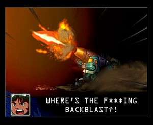 - In the Dark Forces Saga, there's a rocket launcher that has its backblast expelled in front of the player - though it's at right angles to the rocket launcher, so it can't harm the player. The barrel also moves away from the rocket, absorbing some of the recoil.