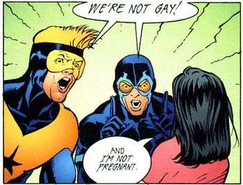 - Subverted in Young Avengers: Billy's trying to tell his parents he's a superhero but ends up coming out to them in a totally different way - except that he really is gay and his parents think his boyfriend is the perfect son-in-law.