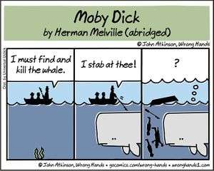 Either way, the plot follows a man that, infatuated with the sea (apparently, it's a periodical thing), decides to go aboard a whaling ship to try out how whaling feels. He and his newly-met best friend Queequeg go upon the Pequod under the command of the monomaniac Captain Ahab, and eventually get in the middle of his maniac hunt for Moby Dick, the eponymous "White Whale" that ate his leg. Tragedy ensues.