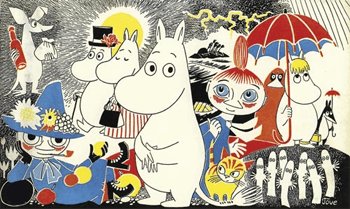 First created as a series of Swedish-language children's books by Swedish-Finnish author Tove Jansson, Moomin is a well-loved franchise starring a the titular hippo-like Moomins, who live in the Finnish woods and have adventures with their friends. The cast of characters is varied, ranging from little childlike humanoids to animal creatures from all over the world. The books themselves are surreal, often scary, somewhat philosophical, and very interactive. Following the success of the books, the franchise was extended into a comic strip, a BBC puppet show, an animated series, an anime (produced and highly popular in Japan) and a few as-yet untranslated movies.
