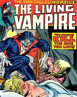 - Our Vampires Are Different:Besides himself being different (notice the "living vampire" moniker), he also inadvertently created another different vampire called Blade. This is mostly because Roy Thomas wanted to create a vampire enemy for Spider-Man but the Comics Code forbid the depiction of the undead. Because of this, vampires were Killed Off for Real in the Marvel universe (for a decade or so anyway). They got around this by making Morbius a vampire created through science, rather than the more typical supernatural methods.