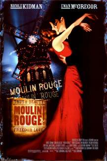 Flashback to 1899 where Christian, an earnest young poet, has left his Victorian London home and his overbearing father in order to live an intellectual life amongst the Bohemian revolutionaries of Paris's bawdy, colorful Montmartre district. Soon after his arrival, an unconscious Argentinean falls through his roof, quickly followed by a dwarf dressed as a nun...or, as he introduces himself, Henri Marie Raymond de Toulouse-Lautrec Montfa, painter, actor, and Bohemian revolutionary extraordinaire. He, along with the Argentinean (narcoleptic, as it turns out) and the rest of their theatre troupe are in the flat above, rehearsing their musical spectacle which will, of course, revolutionize the artistic world as they know it—provided, of course, that they receive the patronage of Harold Zidler, owner of the Moulin Rouge, the hottest nightclub-slash-brothel in Paris. The Moulin is soon to be converted into a theater in order to launch a new career for Zidler's "Sparkling Diamond", Satine (Kidman), the club's highest-paid courtesan and star attraction. Zidler, in turn, is relying on the patronage of the odious Duke++ (Richard Roxburgh) whose only condition in signing away the fortune it will take to convert the Moulin into a theater is that Satine become his mistress. The Duke gets his courtesan, Zidler gets his theater, and Satine gets the acting career she's always dreamed of; it's a perfect set-up, which is why it will go horribly, inevitably wrong.